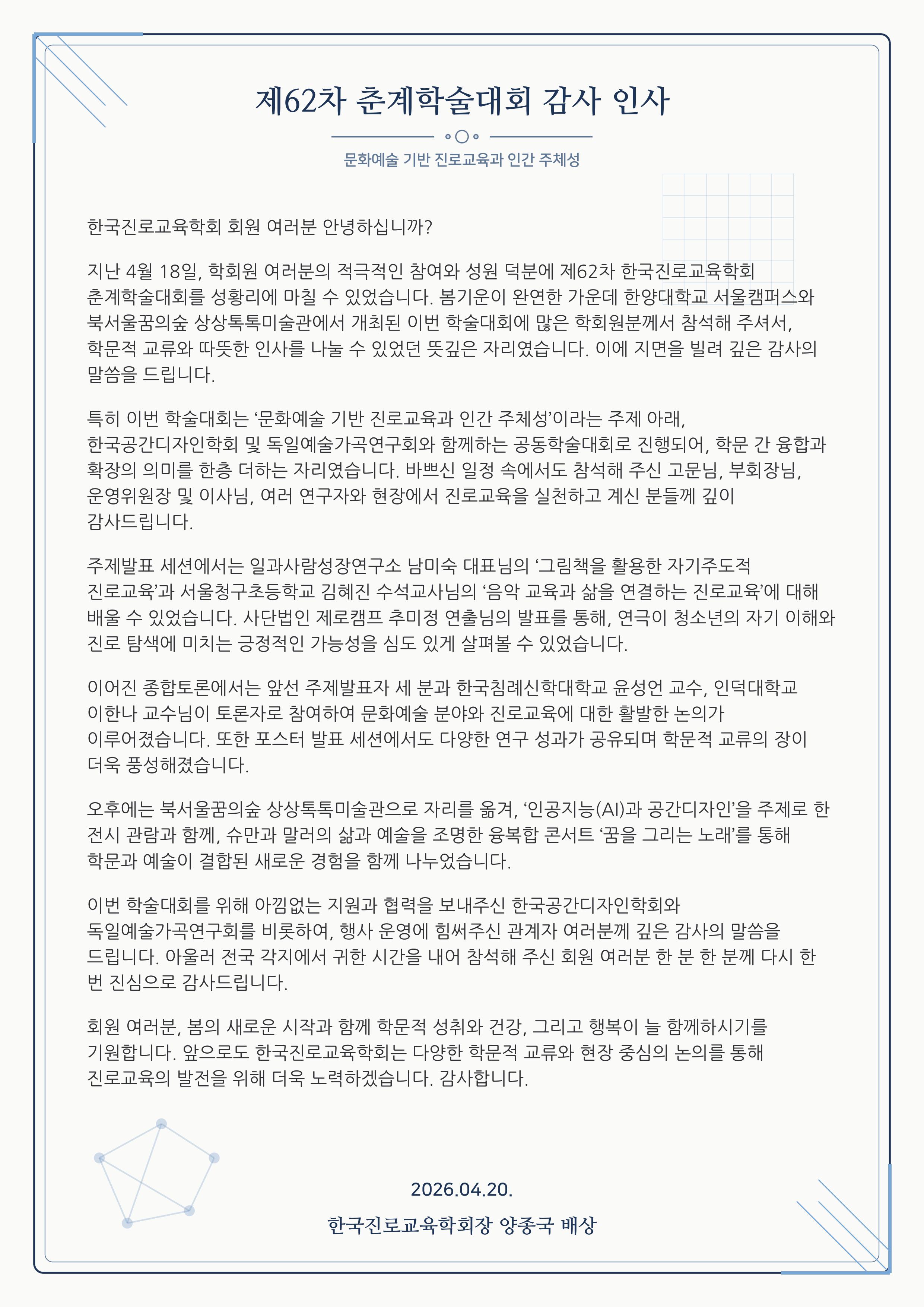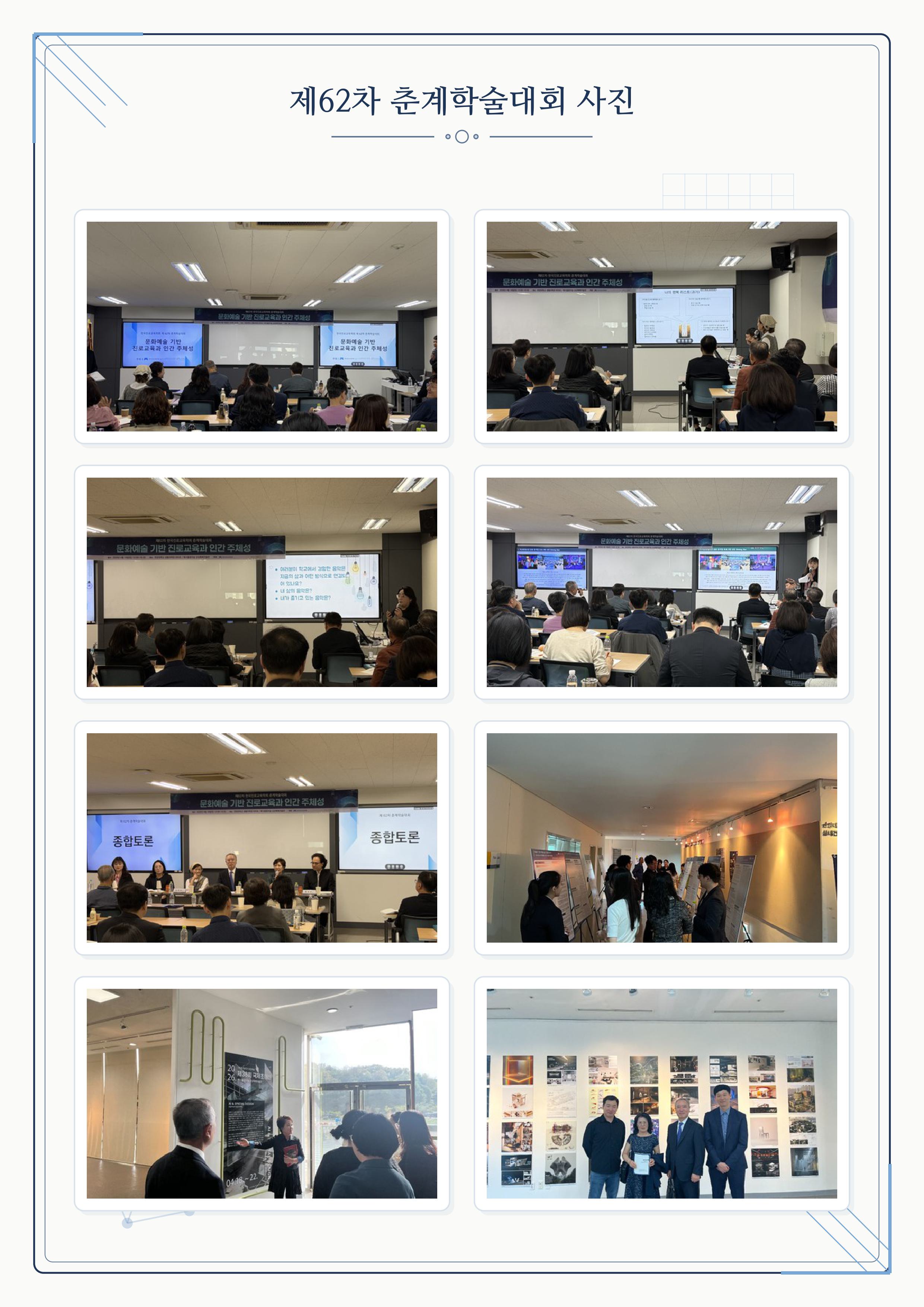 이번 학술대회는 ‘문화예술 기반 진로교육과 인간 주체성’을 주제로, 다양한 학문적 논의와 교류가 이루어진 뜻깊은 자리였습니다. 바쁘신 일정에도 불구하고 참석해 주시고, 함께해 주신 모든 분들께 진심으로 감사의 말씀을 드립니다.