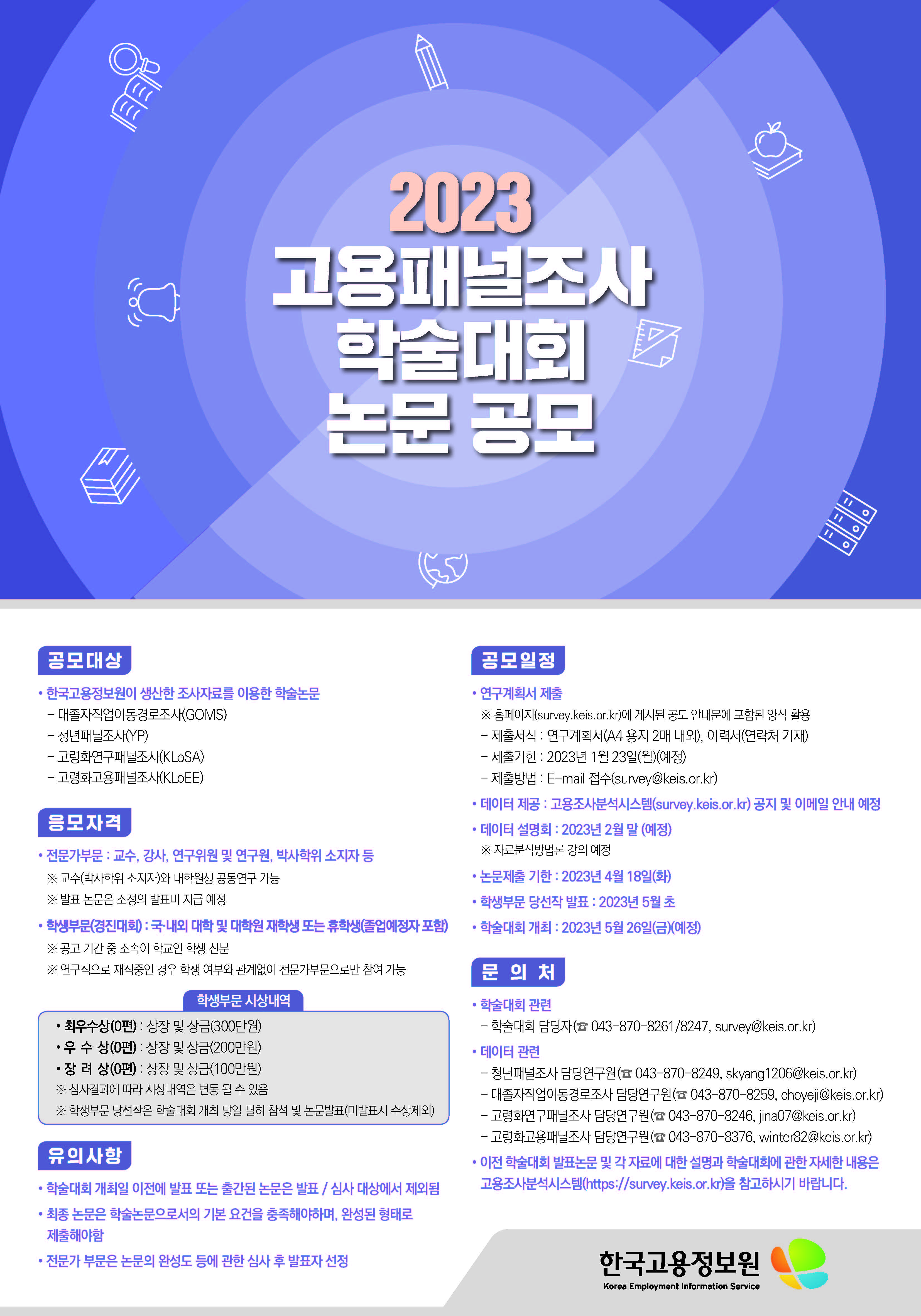 ※ 자세한 사항은 첨부파일 「2023 고용패널조사 학술대회」 논문 공모 안내(연구계획서 포함) 및 「2023 고용패널조사 학술대회」 논문 공모 안내 포스터를