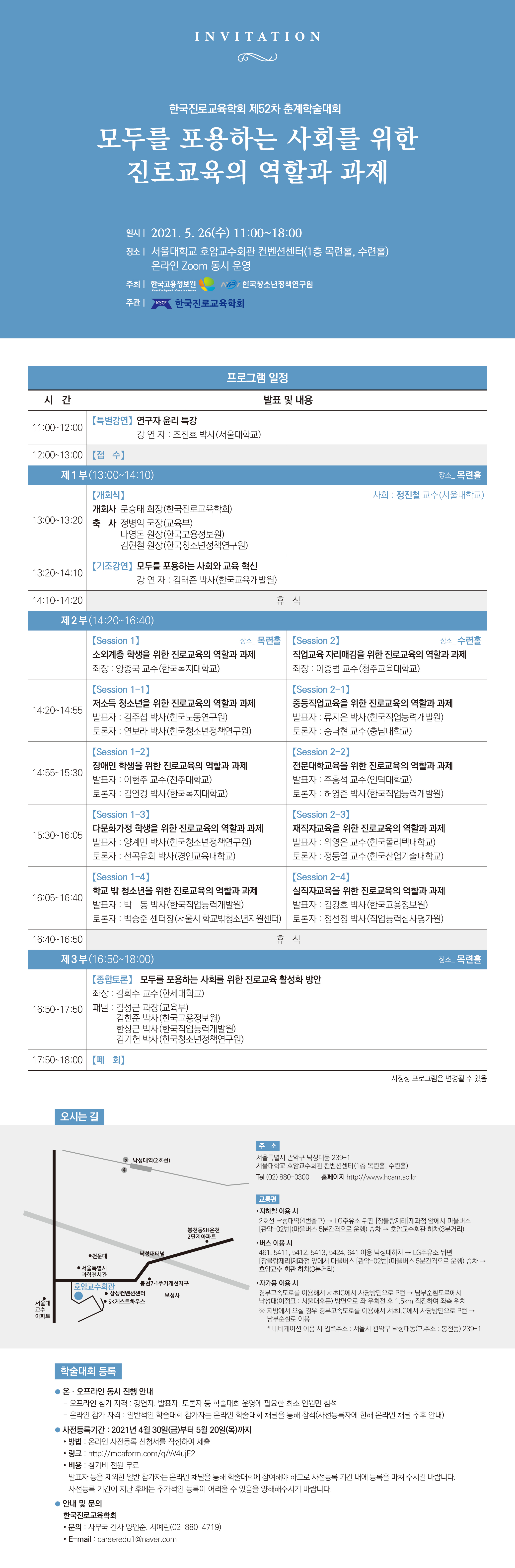 한국진로교육학회는 오는 5월 26일(수) 서울대학교 호암교수회관 컨벤션센터에서 '모두를 포용하는 사회를 위한 진로교육의 역할과 과제'라는 주제로 제52차 춘계 학술대회를 개최하고자 합니다.