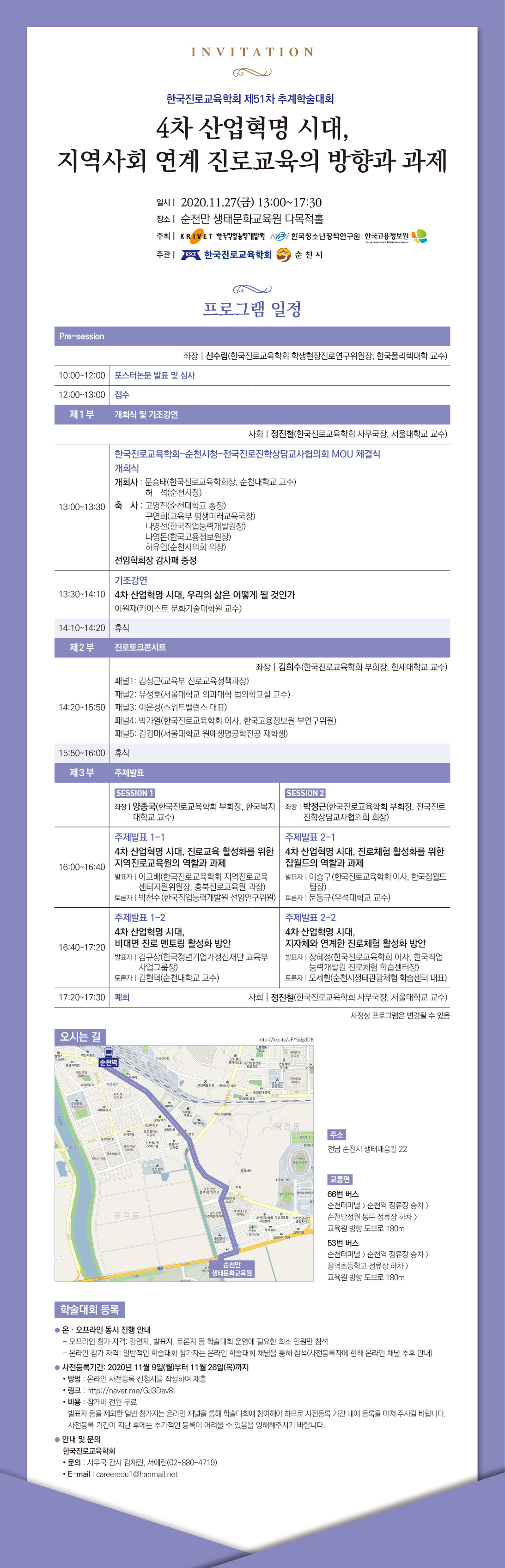 이번 학술대회는 기 안내드린 바와 같이 코로나19의 전국적인 확산세로 인해 온오프라인으로 동시 진행될 예정이며, 발표자, 토론자 등 일부 참석자를 제외한 모든 일반 참가자는 온라인을 통해 학술대회에 참여할 수 있습니다.